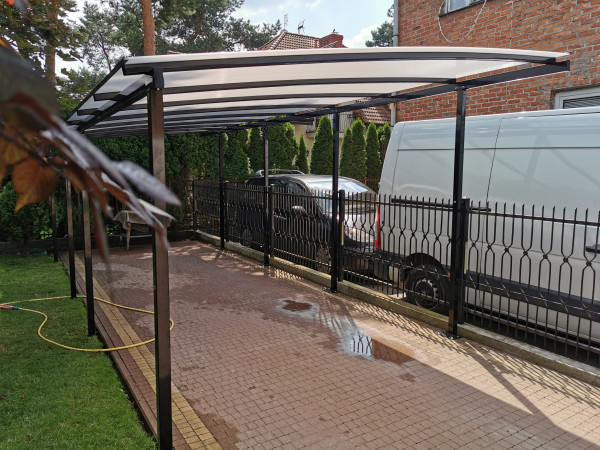 Stosujemy zaawansowany system montażowy: każda wiata z poliwęglanu (płyta 10 mm) posiada pokrycie mocowane przy użyciu profesjonalnych docisków aluminiowych z systemową uszczelką. Gwarantuje to pełną szczelność, co jest kluczowe dla zachowania trwałości zadaszenia na samochód przez lata i wyróżnia nasze realizacje na tle konkurencji.